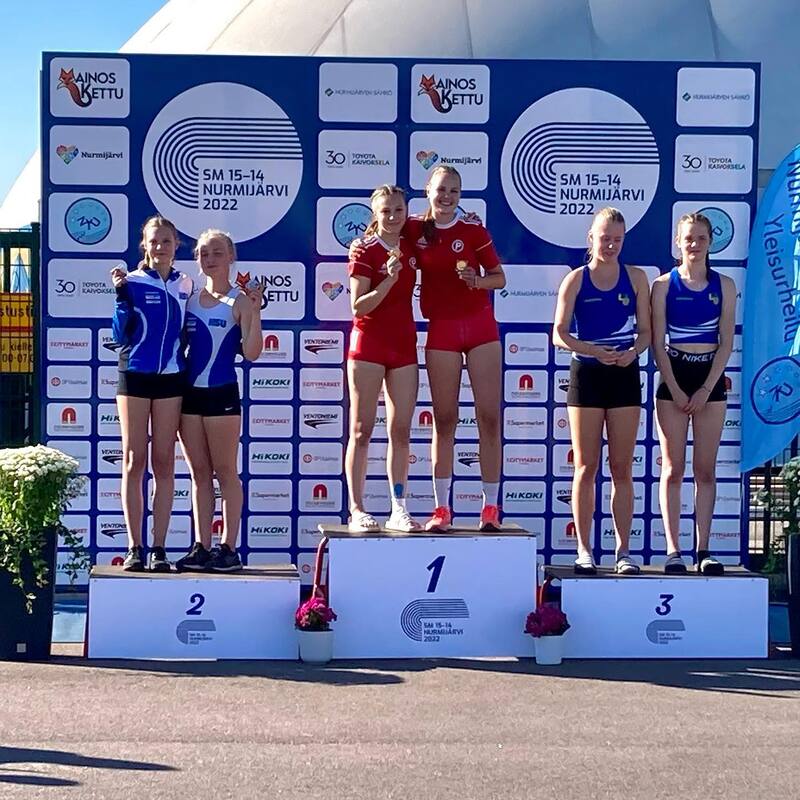 Sissi Kaksonen kilpaili sunnuntaina vielä 300 metrillä. Alkuerät meni Sissillä onnistuneesti läpi voimia säästellen. Finaalissa Sissi näytti todelliset voimansa ja karkasi voittoon huippuajalla 40.59. Mitali oli Sissin kilpailujen toinen ja ensimmäinen Suomen mestaruus. Mitaleja saatiin lisää vielä joukkuekilpailujen muodossa kaksi kappaletta. Ensimmäisenä P15 sarjan 3-loikassa Matias Virta ja Henri Kovanen loikkivat joukkuekisassa ykköspallille. Matias oli yksilökisassa 7. ennätyksellään 11.96 ja Henri 13. myöskin uudella ennätyksellä 11.10. Heti poikien perään T15 sarjan korkeudessa Ester Solismaa ja Elsa Pinola hyppäsivät joukkuehopealle. Ester oli yksilökisassakin komeasti viides tuloksella 153 ja Elsa 10. tuloksella 145. Lempäälässä oli myös HSU:n urheilijoita mukana vielä viimeisenä päivänä. Taneli Hyvärinen teki kisojen kolmannen ennätyksensä M17 sarjan 200 metrillä, joka kirjataan nyt lukemiin 23.92. Hieno juoksu oikeutti finaaliin, jossa tuli myös kelpo aika 24.16 ja kahdeksas sija. N17 Sarjassa Isla Sokoff sivusi kauden parasta tulostaan ja hyppäsi kuudenneksi tuloksella 3 metriä. HSU:lle kertyi siis yhteensä viisi henkilökohtaista mitalia, sekä mitalit kahdesta joukkuekilpailusta. HSU onnittelee kaikkia mitalisteja hienoista suorituksista!