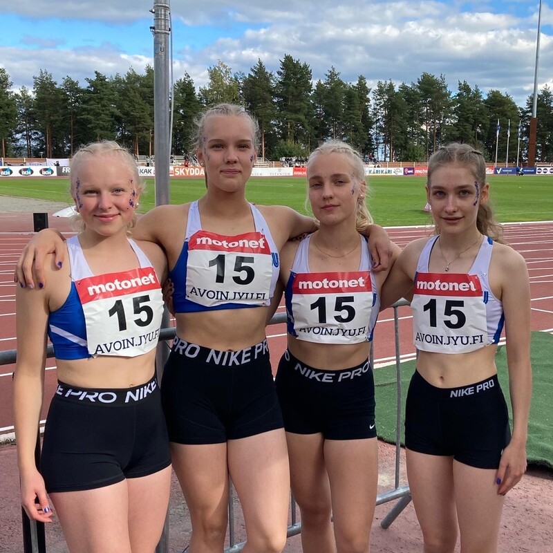 SM-viestit Jyväskylässä 10.–11.9. SM-viesteihin HSU:sta lähdettiin tänä vuonna yhdellä joukkueella. T15 sarjan 4x100 metrin joukkueessa juoksivat Neela Jakonen, Elsa Pinola, Anni Huttunen, sekä Sissi Kaksonen. Seitsemän erän alkueristä tytöt selviytyivät jatkoon oman eränsä voittajana uudella HSU:n T15 & N17 sarjojen seuraennätyksellä 51.49. Aika riitti B-finaaliin, jossa tytöt tulivat toisena maaliin ja aikakin parantui vielä hieman lukemiin 51.44. Kokonaistuloksissa sijoitus oli hieno yhdeksäs! |
