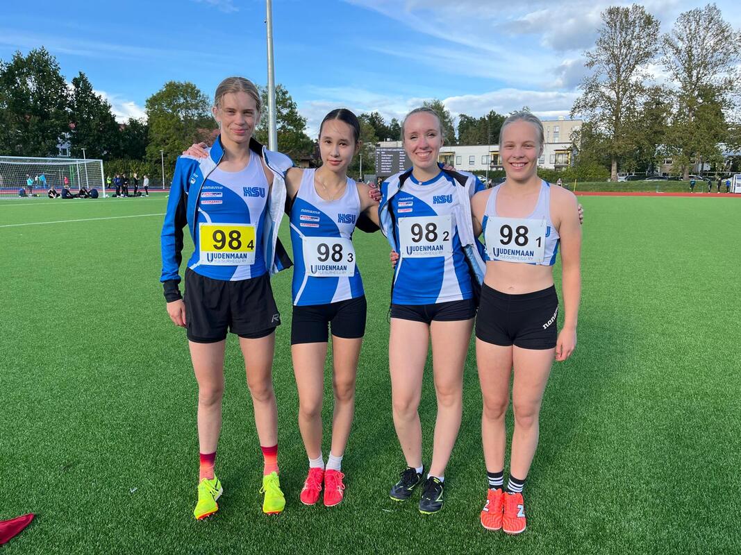 26.-27.08.2025 Eteläisen alueen AM-viestit, Järvenpää Tiistaina Aluemestaruusviesteissä tulessa olivat N15 viestijoukkueemme 4x100m ja 4x800m. Erityisesti pitkän viestin joukkue juoksi kenraaliharjoitustaan ennen SM-viestejä Lahdessa. Eteläisen alueen kisoihin tulevat mukaan kovat pääkaupunkiseudun joukkueet sekä Lahden joukkueet. Siten kisataan jo lähes SM-tasolla. Pikaviestissä juoksivat 1. Miisa Virtanen 2. Ansa Viero 3. Kristina Tikkanen 4. Mette Borremans. Joukkue juoksi hienon ajan 57,04, saman ajan kuin nemesiksemme Riihimäen Kisko, joka kirvelevästi tuhannesosilla meni meidän edelle. Pitkän viestin joukkueessa juoksivat 1. Mette Borremans 2. Veera Tiiliharju 3. Lumi Vilhunen 4. Nella Jääskeläinen. Kenraaliharjoitus meni hienosta aikaan 10.40,96 ja neljäntenä HKV, Espoon Tapioiden ja KU-58 jälkeen. Pitkän matkan ykköstykkimme Senni ei päässyt näihin kisoihin ja häntä tuurasi hienosti 13v Lumi. SM-kisoihin tytöt pohti järjestykseksi Nella, Mette, Veera, Senni sekä lähdetään tavoittelemaan Suomen kärkeä, jota AM-mestaruuden voittanut HKV ehdottomasti on. Haasteeksi joukkueelle voisi laittaa ajan 10.15. Se alittaisi kirkkaansa HSU:n seuraennätyksen kymmenen vuoden takaa: 10.25,96 (N.Talvitie-S.Saalo-S.Saalo- E.Simberg) |
