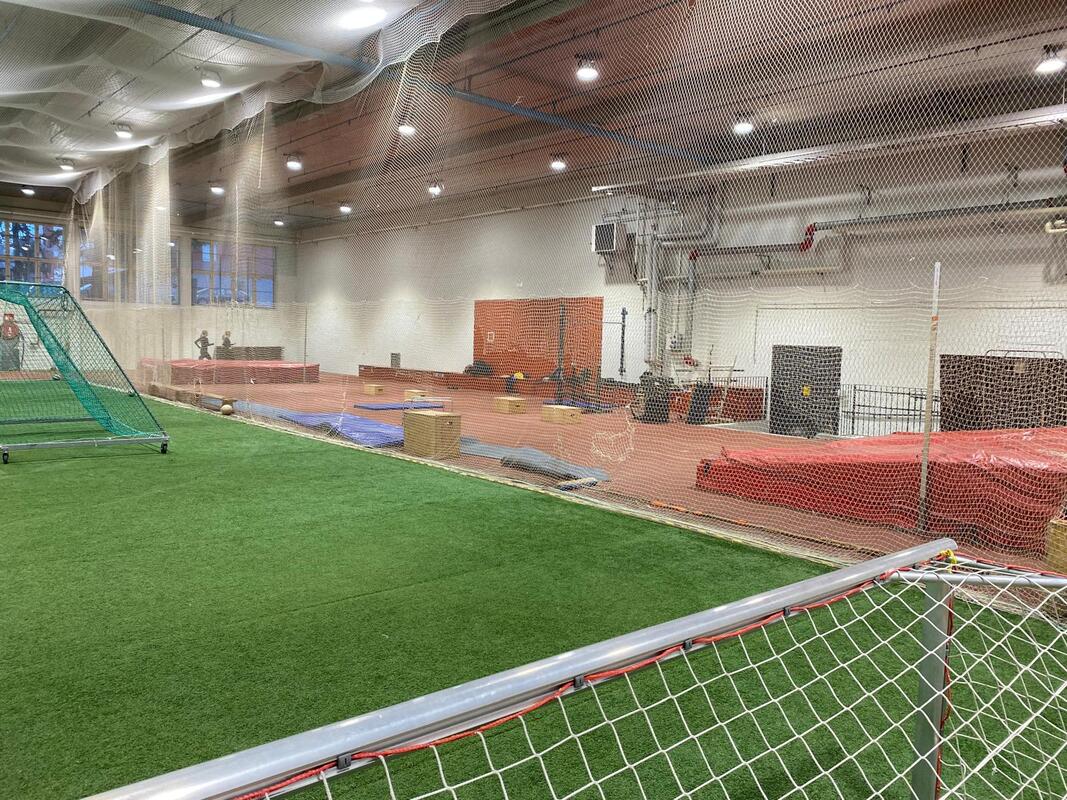 Areenan remontista jäi ylimääräiseksi vanha kattoverkko sekä vihreä lyöntiverkko. Sissipartio Tero, Harjun Janne ja Rosa kävivät tänään ripustamassa verkkoa juoksusuoran ja hyppyalueen suojaksi 2m korkeudelle asti. Tarjoituksena oli saada kolminkertaisen verkon imemään pallojen voima ja siten pienentää verkon heilahtelua. Ja saada alareuna entistä tiiviimmäksi ettei pallot lipsu verkon ali tielle. Ajatus on, että katsellaan viikko miten lisäverkotus vaikuttaa sekä juonitaan lisää verkotusta jos on tarpeen. Verkotus on vahingossa kiinnitetty eri lailla kuin viime talvena. Varsinkin korkeuspatjan luona oleva lyöntiverkko on väärällä puolella ja vuotaa palloja läpi. Verkkojen sijoittelu korjataan viimeistään joulutauolla kun Areenalla tapahtumien takia verkot otetaan alas. Areenan remontin iso juttu oli valaistuksen uusiminen. Uusi kirkas valaistus piristää huimasti tunnelmaa, varsinkin kun seinät on siistitty ja maalattu valkoisiksi. Seiniltä ja seinustoilta on purettu käytöstä poistettuja laitteita, sähköokteloita ja -johdotuksia. Juoksusuoran patja uusitaan, mutta se tulee piakkoin. Vanha, risainen kattoverkko on uusittu ja pingotettu siistiksi. Vessojen ja suihkujen saippuaannostelija, vessapaperitelineet yms uusittiin. Tavara-arkkujen alle tullaan laittamaan korokejalat, että niitä voi siirrellä pumppukärryllä. Tero innostui imuroimaan ja siivoamaan turhat roinat pois laatikoista.