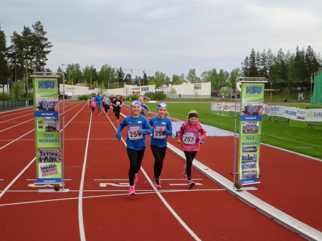 Kertun lennokas juoksuaskel. Tanja ja Emma yrittävät pysyä perässä. Kerttu vei voiton kierroksissa, 26. Sitten Tanja 16 ja Emma 10