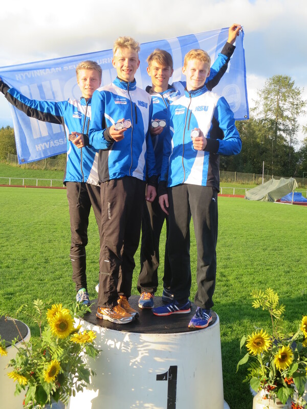 Moniottelun Suomen mestaruuksista kamppaillaan 5.-6.9. Huittisissa ja Sastamalassa. Jo ensimmäinen kilpailupäivä sujui loistavasti HSU:n joukkueelta. P14 sarjassa Jermu Tarkiainen ja Marcus Kytölä kilpailivat Huittisissa. Kilpailu oli todella kovatasoinen ja sisälsi jännitystä viimeiseen lajiin saakka. Molemmat pojat aloittivat hienosti aidoissa ja pituudessa tekemällä ennätyksensä. Jermu tulokset 100aj. 15,85 ja pituudessa 538 sekä Marcuksen vastaavat 14,22 ja 638. Jermu jatkoi samaa ennätyslinjaa heittämällä keihäässä 41,52. Marcus taas epäonnistui heittämällä vain 32,58. Seipäässä molemmat pojat kohensivat hienosti asemiaan Maria Kytölän vinkeillä, joka saapui paikalle ohjaamaan poikien seiväshyppyä. Marcuksen tulos oli 432 ja Jemun 372. Päätöslajiin lähdettäessä Marcus oli johdossa vain pisteen turvin Severi Mäntylään (Porvoon Akilles). Jermu oli tässä vaiheessa kolmantena. Uusilla 1000m ennätysajoillaan pojat säilyttivät hienosti sijoituksensa. Tuloksena siis kulta, pronssi ja yhdessä hankittu joukkuekulta. Marcus ja Severi Mäntylä rikkoivat tiukassa kamppailussa molemmat myös vanhan ikäluokkansa SE:n. Marcuksen uudet ennätyspisteet kirjataan 3528 ja Jermun 2924. P15 sarjassa Aapo Nieminen ja Ilmari Niiranen kilpailivat Sastamalassa. Molemmat pojat kamppailivat hienosti ja tekivät henkilökohtaiset otteluennätyksensä, Aapo pisteillä 2253 ja Ilmari 2225. Samoin yksilölajeissa tuli molemmille useita uusia ennätyksiä. Aapon sarja (100aj 16,67, pituus 512, keihäs 36,87, seiväs 280, 1000m 3,21,00). Ilmari vastaava (15,10, 536, 24,35, 240, 3,20,54). Näistä uusista ennätyksistä pojat palkittiin joukkuekilpailun pronssimitaleilla. Sunnuntaina Huittisten kentällä Iida Tolonen ja Siiri Saalo lähtivät avoimin mielin 5-otteluun hakemaan omia parhaita suorituksia. Ekassa lajissa 80m:n aitajuoksussa Iida pääsikin lähelle omaa parastaan ja Siiri taas juoksi reilusti oman ennätyksensä aikaan 12,24, joka oli yli 40 15-vuotiaan tytön joukossa 5:nneksi nopein aika. Aitojen jälkeen siirryttiin heti pituuspaikalle. Siiri onnistui heti ensimmäisellään hyppäämään ennätyksensä 501, ja oli pituudessa 10. Iida epäonnistui ensimmäisellä yrityksellä ja jätti kaikkia jännittämään, kun moniottelussa kenttälajeissa on vain 3 yritystä. Toisella Iida kuitenkin pamautti lukemat 455, jolla paransi omaa ennätystään puoli metriä! Siiri oli kauden tilastoissa 6. ja kahden lajin jälkeen Siiri olikin pistesijan tuntumassa sijalla 8. Keihäs toi lisää jännitystä kun kumpikaan ei saanut ensimmäisellä heitolla tulosta. Siiri sai kuitenkin tekniikkavirheet korjattua ja toinen heitto oli koko kisan pisin 40,23m ja nosti Siirin keihään jälkeen jopa 2. sijalle! Iida jätti katsojia taas jännittämään kun vasta kolmannella sai onnistuneen heiton joka kantoi 28,34m. Iida jäi jonkin verran ennätyksestään, mutta oli silti keihäässä 14. sijalla! Valmentaja sai huokaista helpotuksesta, ja näin myös tyttöjen joukkuekisa pääsi jatkumaan! Neljäntenä lajina oli korkeushyppy. Iida hyppäsi 130 ja oli edelleen reippaasti edellä omaa ennätyssarjaansa. Siiri onnistui yli odotusten ja kohensi omaa korkeusennätystään 4cm tulokseen 157, jolla oli korkeudessa 7. Viimeinen laji oli 800m, johon edelleen 36 kilpailijaa lähti. Iida päätti oman ottelu-urakkansa upeasti juoksemalla oman ennätyksensä 2.44,16, ja loppupisteet parantuivat yli 200 pisteellä tulokseen 1567! Tasaisen sarjan ansiosta Siiri oli ennen päätöslajia 3. sijalla. Kärkikamppailussa mukana oli kuitenkin todella kovia 800m:n juoksijoita ja mitään ei ollut ratkennut vielä. Siiri tiesi että sijoituksensa pitäminen vaatisi venymistä myös viimeisessä lajissa, ja Siiri lähti ennakkoluulottomasti kokeilemaan omia rajojaan. Uusi ennätysaika kirjataan 2.28,25, joka oli 10. paras aika, mutta loppupisteillä 2665 Siiri nappasi kovassa seurassa pronssin! Siiri teki melkoisen tempun; 6 ennätystä 5-ottelussa, ja yhteispisteet paranivat alkukesästä lähes 300 pistettä. Joukkuekisassa Siiri ja Iida sijoittuivat hienosti 5:nneksi 12 joukkueesta! Samanaikaisesti Sastamalassa T14 sarjassa kamppailivat hienosti Nelli Talvitie ja Milla Rasinkangas. Parhaita tuloksia työt tekivät aitajuoksussa ja keihäänheitossa. Aidoissa molemmat ottivat upeasti erävoiton ja keihäänkeitossa sijoituttiin kärkeen, Nelli lajissa kolmas ja Milla viides. Henkilökohtaisessa kilpailussa Nelli oli hienosti kahdeksas pisteillä 2064. Nellin sarja (80m aj 12.98, pituus 459, keihäs 34.49, korkeus 147, 800m 2.52.34). Millan vastaava (14.58, 389, 31.47, 144, 3.15.63) ja otteluennätys 1576, parani 70 pisteellä. Tytöt sijoittuivat tiukassa kisassa lopulta joukkuekilpailussa 4:nneksi 9 joukkueesta. Yhteensä 14- ja 15-vuotiaissa HSU oli mitaleissa laskettuna paras seura! Onnittelut kaikille hienoista saavutuksista! |