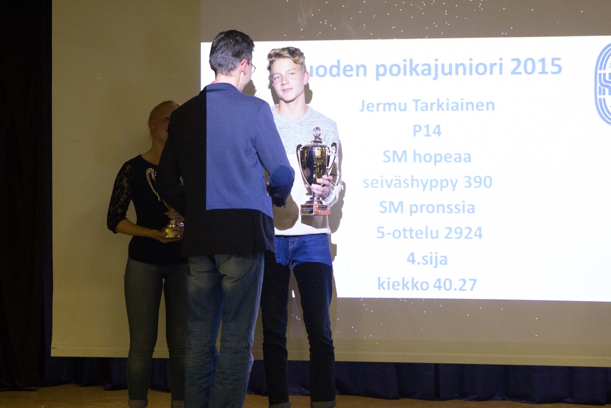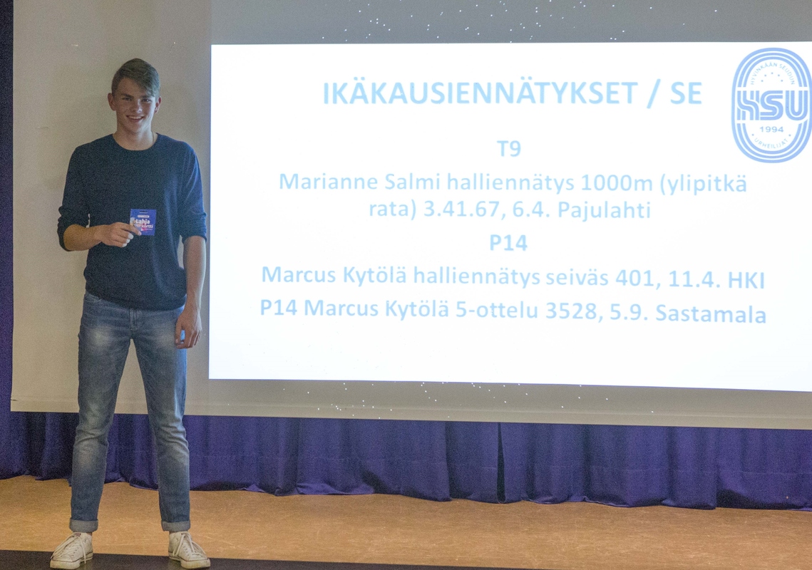 HSU vietti historiallisen hienon kauden 2015 päättäjäisiä perjantai-iltana. Juhlatapahtumassa olikin reilusti osallistujia, toista sataa HSU:laista. Päättäjäistunnelmaa nostattivat katsaukset kuluneeseen kauteen sekä runsaslukuiset urheilijoiden ja seuratoimijoiden palkitsemiset. Vuoden 2015 SM mitalistit ja pistesijan saaneet P14 Marcus Kytölä 3 SM kultaa: pituushyppy 632, seiväshyppy 435, 5‐ottelu 3528 SM hopeaa: halli 5‐ottelu 3380 P14 Jermu Tarkiainen SM hopeaa: seiväshyppy 390 SM pronssia: 5‐ottelu 2924 4.sija: kiekko 40.27 T14 Nelli Talvitie 6.sija: korkeus 1.60 P15 Ilmari Niiranen 5.sija: 100m aj. 14.58 T15 Saara Saalo SM hopeaa: 3000m kävely 16.31.40 T15 Siiri Saalo SM pronssia: 5‐ottelu 2665 4.sija: seiväshyppy 330 N17 Hanna‐Mari Saalo SM hopeaa: halli kiekko 43,86 SM pronssia: kiekko 40.13 N17 Kaarina Lehtonen 5.sija: 3000m 10.48.98 M19 Frano Vainio‐Doiseul 4.sija: 200m 22.21 N19 Maria Kytölä SM pronssia: halli seiväshyppy 346 4. sija: seiväshyppy 325 6. sija: pituushyppy 550 SM viestit P15 SM pronssia Ilmari Niiranen, Jermu Tarkiainen, Aapo Nieminen,Marcus Kytölä, Niilo Kantoniemi: 4x80aj 48.02 SM-joukkuemitalistit T14 Nelli Talvitie ja Milla Rasinkangas 2 SM joukkuekultaa: keihäs, korkeus P14 Marcus Kytölä ja Jermu Tarkiainen 2 SM joukkuekultaa: seiväshyppy, 5‐ottelu T15 Siiri Saalo ja Iida Tolonen SM joukkuepronssia seiväshypystä P15 Aapo Nieminen ja Ilmari Niiranen SM joukkuepronssia 5-ottelusta IKÄKAUSIENNÄTYKSET / SE T9 Marianne Salmi halliennätys 1000m (ylipitkä rata) 3.41.67, 6.4. Pajulahti P14 Marcus Kytölä halliennätys seiväs 401, 11.4. HKI P14 Marcus Kytölä 5‐ottelu 3528, 5.9. Sastamala UUDY:n Piiriennätykset 2015 T9 Marianne Salmi, 800m 2,44,63 ja 1000m 3.33.20 P11 Arno Toivola, 4‐ottelu 1443 P12 Juho Kantoniemi, 200m aj. 36.51 ja kiekko 29.28 P14 Marcus Kytölä, seiväs 435, pituus 638 ja 5‐ottelu 3528 Urheilijapalkinnot: Vuoden urheilija: Hanna-Mari Saalo N17 Vuoden tyttöjuniori: Saara Saalo T15 Vuoden poikajuniori: Jermu Tarkiainen P14 Vuoden aikuisurheilija: Allan Juntunen M75, kannustuspalkinto Liisa Lehto N70 4-5v tsempparit Sara Poikolainen ja Miro Reiman 6-7v tsempparit Sanni Maasola ja Elias Oksanen 8-9v Ruth Toivola ja Olavi Halonen, tsempparit Iisa Aramo ja Eeli Rovasalo 10v Aino Laitinen ja Miko Koskelainen, tsempparit Laura Ylönen ja Eelis Aramo 11v Inkamari Letto ja Arno Toivola, tsempparit Viola Nordlund ja Topias Talvitie 12v Laila Lehtinen ja Juho Kantoniemi, tsempparit Emma Rovasalo ja Justus Talvitie 13v Venla Toivola ja Eeli Vuola, tsempparit Tia Palmunen ja Pyry Kalanen 14v Nelli Talvitie ja Marcus Kytölä, tsempparit Milla Rasinkangas ja Santeri Tuomi 15v Siiri Saalo ja Ilmari Niiranen, tsempparit Emma Simberg ja Aapo Nieminen 17v Kaarina Lehtonen ja Teemu Mustonen, tsempparit Tanja Sorvari ja Jesper Jääskeläinen 19v Maria Kytölä ja Frano Vainio-Doiseul Aikuisurheilijatsemppari Mia Kemppainen N40 HSU erikoispalkinto: Anton Sokoff, Emilia Rouvinen, Frida Penttinen, Noora Hietala, Mette Martikainen Vuoden seuratoimijat Vuoden toimitsija: Monna Poikolainen Vuoden aktiivi: Katja Hietala Vuoden valmentaja: Henna Koskelainen Vuoden tulokas: Yvonn Lindholm HSU teko: Markku Kytölä Yhteistyöpalkinto Aamuposti Terhi Collin Hyvinkään Kaupunki Jorma Luukkola Katsaus urheiluvuodesta 2015 HSU, jonka 21-vuotiseen seurahistoriaan mahtuu ylä- sekä alamäkiä, teki kuluneella vuonna mahtavan nousun yleisurheiluseurojen parhaimmistoon. Viime syksynä seuran valmennustoimikunta laittoi varsin kunnianhimoiset tavoitteet vuodelle 2015. Seuran urheilijat harjoittelivat ja kilpailivat kuitenkin siihen malliin, että kaikki suurimmatkin odotukset ylitettiin reilusti. Lasten liikunnassa tavoitteena oli tarjota mahdollisimman monelle Hyvinkään talousalueen lapselle monipuolinen ja turvallinen tapa tutustua liikuntaan ja kilpailemiseen. Ryhmät harjoittelivat ahkerasti kesän aikana maanantai- ja keskiviikkoiltaisin urheilupuistossa. Kyseisinä iltoina oli vilskettä kun yli 100 lasta oli kentällä yhtä aikaa harjoittelemassa. Välillä tuntui, että kyseessä olisi ollut joku suuri ottelu, kun urheilupuiston parkkipaikat olivat kaikki varattuina. Seurakilpailut, jotka on tarkoitettu juurikin perheen pienimmille (4-13v), uudistettiin myös tänä vuonna, nimeltään Silja Line seurakisat. Kilpailut olivat kaikille avoimet, matalan kynnyksen kilpailut, jossa tarkoituksena oli tutustuttaa lapset yleisurheilun eri lajeihin leikinomaisesti. Seurakisat olivat koko perheen yhteinen hauska tapahtuma, jossa myös vanhemmat saivat olla mukana. Kilpailut osoittautuivat erittäin suosituiksi, koska HSU:n järjestämissä kilpailuissa kävi jopa 150 lasta. Nämä lukemat ovat suurimpia osallistumislukuja koko Suomessa. Kuluneella kaudella HSU eteni myös ensimmäistä kertaa seurahistoriassaan Vattenfall Seuracupin tera-sarjan finaaliin. Kahden osakilpailun perusteella valitut Suomen suurimpien kaupunkien finaalijoukkueet kilpailivat toisiaan vastaan Tuusulassa. HSU sijoittui tässä kovassa valtakunnallisessa kilpailussa upeasti sijalle 12. Suomen Urheiluliiton Nuorisotoimintakilpailussa HSU:n nuoret sijoittuivat seitsemänneksi kaikkien yleisurheiluseurojen joukossa. Nuorisotoimintakilpailussa pisteet kertyvät 4-13-vuotiaiden piirinmestaruuskilpailujen osanottajamäärän perusteella. Lisäksi pistemäärään vaikuttaa kyseisten ikäluokkien lisenssiurheilijoiden määrä. HSU:n nuoret osallistuivat erittäin innokkaasti piirinmestaruuskilpailuihin ja suurin osa kisamatkoista toteutettiinkin yhteiskuljetuksella linja-autolla. Vaikka kilpailun kokonaissijoitus itsessään oli mahtava, niin vieläkin paremmin pärjäsimme moniotteluiden-osapisteissä. Siinä olimme Suomen paras seura. Uudenmaan piirissä kilpailtiin myös tänä vuonna Nuorisocupissa. Kilpailussa piirin 9-15- vuotiaat nuoret kilpailevat piirinmestaruuskilpailuihin osallistumisista ja sijoituksista. Viime vuosina kilpailun on voittanut Ke