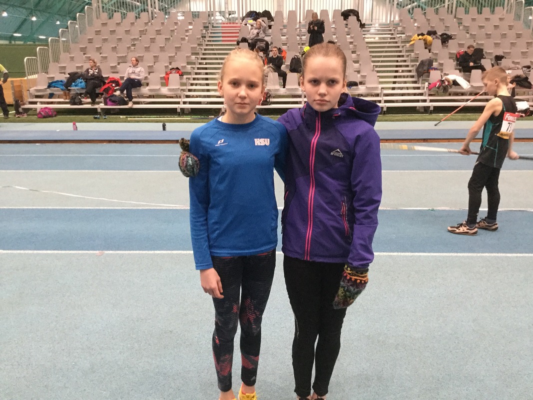 Seuraavalla hyppypaikalla Laila ja Emma jo aloittelivat lämmittelyhyppyjä valmentaja Maria Kytölän valvovan silmän seuratessa askelmerkin osumista. Molemmat tytöt valitsivat aloituskorkeudeksi 220. Lailan kilpailu eteni hienosti puhtaalla pöytäkirjalla korkeuteen 250 asti, hyvistä yrityksistä huolimatta rima tuli tänään kolmesti alas. Tulos kuitenkin hieno 240 ja odottelemaan palkintojen jakoa, tuloksena 3. sija kovatasoisessa T13 sarjassa. Emmankin aloituskorkeus ylittyi helposti, eikä seuraavatkaan rimankorotukset tuoneet pudotuksia. Muutama tarkentava ohje Marialta ja oltiin ennätyskorkeudessa 270, tänään oli Emman päivä ja puhdas pöytäkirja säilyi. Ennätystehtailu jatkui ja rohkeasti 10cm taas rimaan lisää korkeutta, yleisön rytmikkäät tapukset ja uusi komea ennätys 280. Tulos 280 on T13-sarjan kaikken aikojen hallitilastoissa sijalla 13. Eli T13 sarjassa kaksi mitalia matkasi Hyvinkäälle.