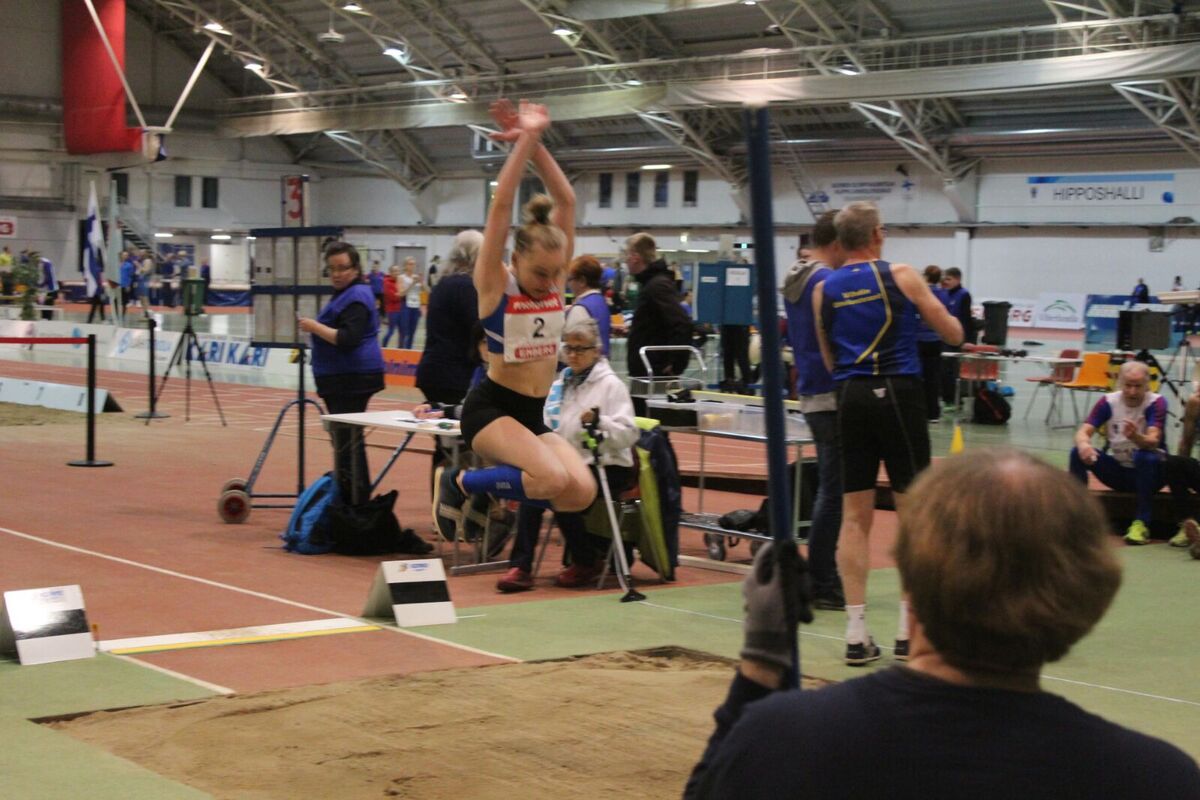 Kiia ja Noora vauhdissa T15-sarjan 5-ottelussa Viikonloppuna ratkottiin hallimoniotteluiden suomenmestaruudet Jyväskylän hipposhallilla 3.-4.3.2018 (la-su). Lauantaina T15-sarjan 5-otteluun osallistuivat Kiia Brandes ja Noora Hietala. T15-sarja olikin kilpailujen ylivoimaisesti suosituin, sillä tyttöjä starttasi otteluun yhteensä 55! Ensimmäinen laji oli 60m aitajuoksu, ottelun jännittävin osa. Ensimmäinen laji kun määrittää paljon sitä, miten ottelu tulee sujumaan. Jos aidoissa epäonnistuu, on haastavaa taistella läpi seuraavat neljä lajia. Kannustusjoukot jännittivät katsomossa, kun tytöt juoksivat molemmat uudet ennätyksensä! Kiian aika 9,92 oli 11. nopein, jonka vanavedessä juoksi hyvin myös Noora ajalla 10,09. Korkeudessa Kiia jatkoi ennätysten tehtailua ylittämällä 141. Noora ylitti 144, ja pienen askelmerkkisäädön jälkeen tiputti 147 harmittavasti kantapäällä. Kahden lajin jälkeen tytöt olivat sijalla 15 ja 16. Kuulan jälkeen tuli pieni pudotus, kun molemmat jäivät vähän omasta parhaastaan. Noora työnsi 7,95 ja Kiia 7,39. Tiivis tahti jatkui eikä kovin pitkiä taukoja väliin mahtunut. Neljäs laji, pituus on myös todella herkkä laji, kun ottelussa on kenttälajeissa vain kolme suoritusta. Molemmat tytöt onnistuivat hienosti lähelle ennätyksiään, Noora oli 5,11 kantaneella hypyllä toiseksi paras ja Kiia hyppäsi 4,55. Pituus nosti taas tyttöjen sijoitukset ja Noora lähti 800 metrille 12.sijalta, kun Kiia lähti taistelemaan sijoista 25-30. Noora jäi sekunnin halliennätyksestään ajalla 2.44,50 ja piti sijan 12:ta pisteillä 2131. Kaivattua venymistä ei tullut, mutta tasainen sarja jäi vain pisteen päähän aikaisemmin talvella tehdystä ottelutuloksesta. Kiia juoksi halliennätyksensä 3.04,82, vaikka jäi melko paljon viime kesän ennätysajastaan. Lopputulos 1874 pistettä riitti 30.sijaan, mutta Kiia paransi viime syyskuun SM-kisojen 5-ottelutulosta jopa 456 pisteellä. Hallissa kilpaillaan molemmat sarjat yhdessä, kun ulkona ovat T15- ja T14-sarjat erikseen. 2003-syntyneistä Noora oli lopulta 7. ja Kiia 16., mikä lupaa hyvää kesää ajatellen.