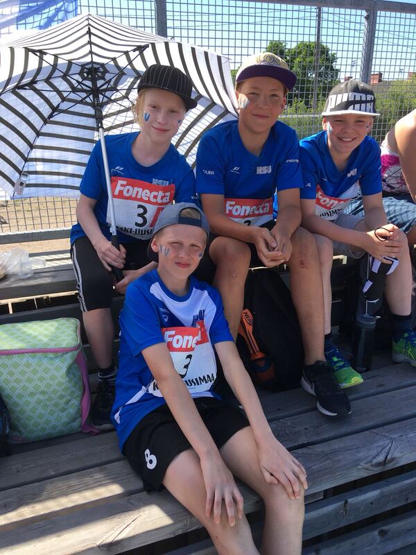 P13-viestijoukkue osasi ottaa lajien välissä myös rennosti katsomossa. Joukkuessa juoksivat Aarni Piri, Olavi Halonen, Aleksis Hurme ja alempana istuva Rasmus Piri