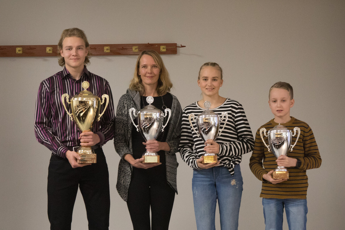 HSUn kiertopalkinnot saivat (vas.) Jermu Tarkiainen (Vuoden Urheilija, Minna Kouhia (Vuoden aikuisurheilija), Emma Rovasalo (vuoden tyttöjuniori) ja Eeli Rovasalo (vuoden poikajuniori)
