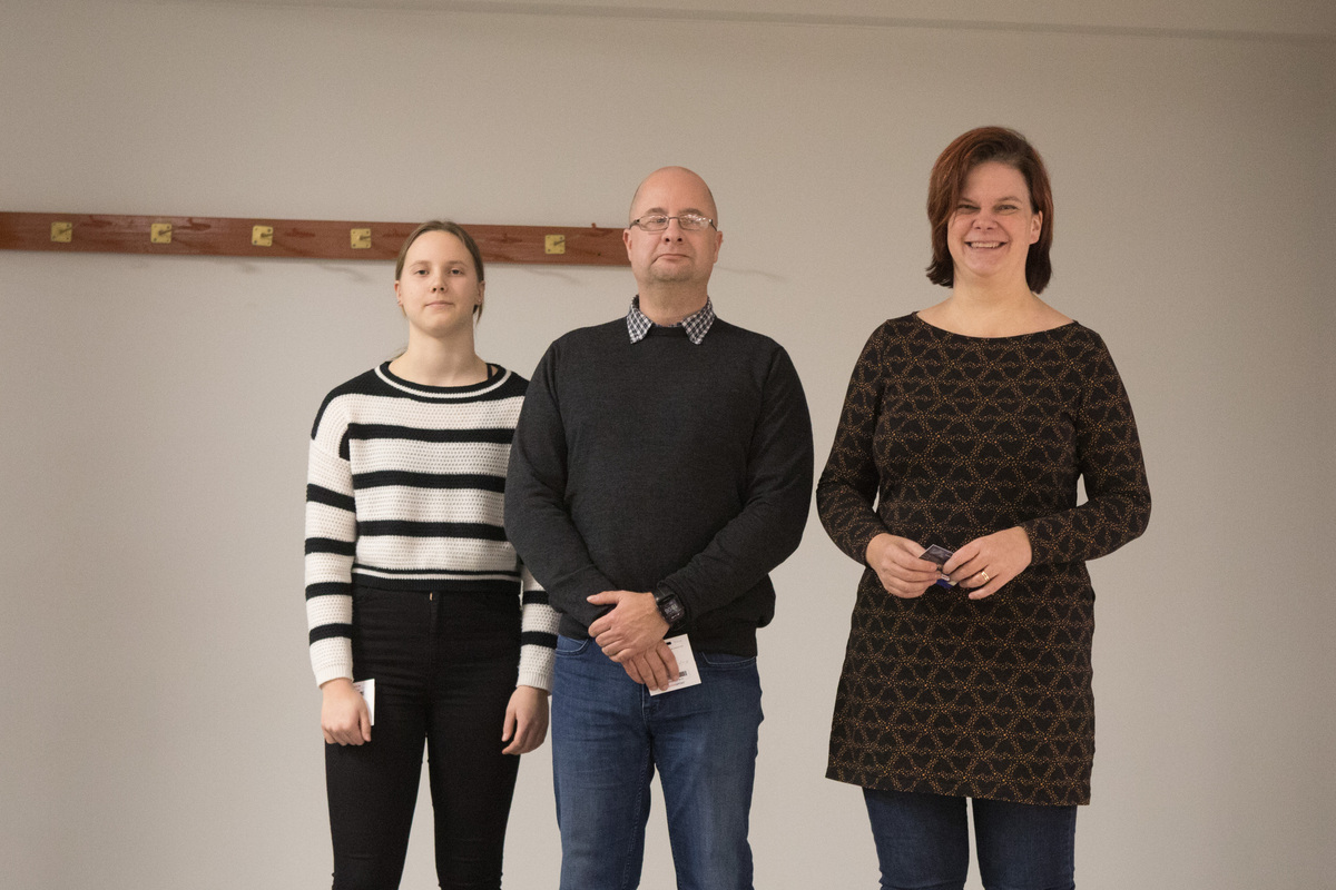 ![Vuoden toimitsijoiksi valittiin (vas.) Meritta Rouvinen (kuvassa tuuraajana toiminut tytär Emilia), Vesa Sokka ja Mervi Martikainen