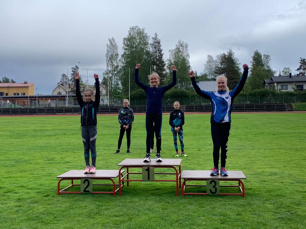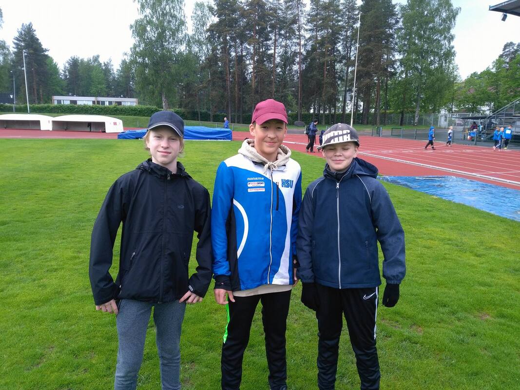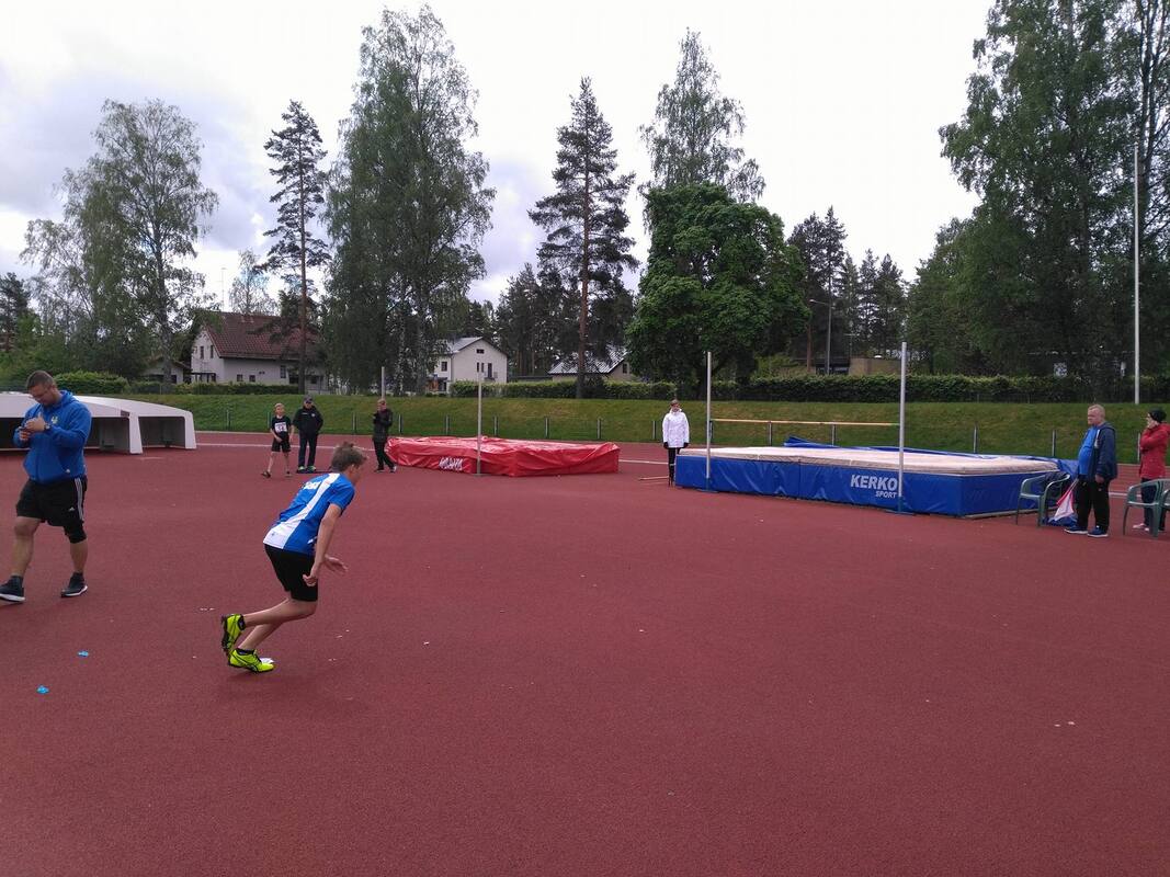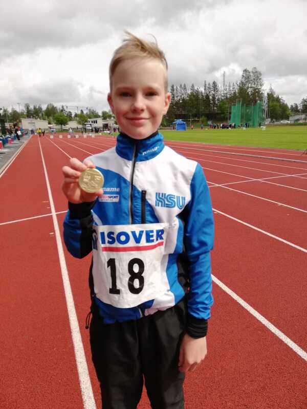 Lauantaina 25.5 kilpailtiin kotikentällämme Hyvinkään urheilupuistossa 9-15v ikäisten pm-junnuottelut. Kilpailut käytiin vaihtelevissa olosuhteissa, jota sävyttivät useat vesisadekuurot. Kilpailut saatiin kuitenkin sujumaan hyvin aikataulussa ja järjestelyt muutenkin onnistuivat kilpailun aikana tasapainoisesti. Valitettavana takaiskuna tuli ainoastaan maalikamerayhteyden ongelmat, jotka kuitenkin saatiin kuntoon ensimmäisten pika- ja aitajuoksumatkojen jälkeen. Haluamme HSUn puolesta kiittää lämpimästi kaikkia pitkän päivän aikana mukanaolleita toimitsijoita hienosta työstänne! Kisat olivat kesän kisatapahtumista suurin voimanponnistuksemme, jotka saimme onnistumaan teidän ansiostanne. Kisapäivänä oli paikalla 23 HSUn urheilijaa. Urheilijat saavuttivat hyvätasoisissa kilpailuissa yhteensä neljä pm-mitalia ja neljä muuta sijoitusta kuuden parhaan joukkoon. Pariin otteeseen mitalisija jäi harmittavan lähelle, mutta urheilijat tekivät kauttaaltaan hienoja suorituksia. T9-sarjassa oli mukana kolme HSUn urheilijaa. 25 osallistujaa keränneessä sarjassa parhaiten sijoittui Senni Koski, joka otteli hienosti viidennellä sijalla yhteispistein 474. Sennin sarja koostui 40m:n matkalla saadusta käsiajasta 7,4, pituushypyn 324cm ja kuulan 4,48m tuloksista. Sennin perässä seitsemänneksi sijoittui Miisa Virtanen pistein 467 (7,1, 3,23m, 3,58m) ja 20:nneksi sijoittunut Nella Jääskeläinen pistein 344 (8,2, 2,63m, 4,50m). P9-sarjassa oli mukana hienosti viisi HSUn urheilijaa.Heistä yhdeksänneksi sijoittui Aatos Rouvinen pistein 389 40m:n juoksun ajalla 7,40, pituushypyn 291cm hypyllä ja kuula 350cm kantaneella työnnöllä. Aatoksen perässä 12:ta sijoittui Niklas Jääskeläinen pistein 324 (8,00, 247, 410), 14:ta Iikka Oksanen (8,30, 262, 3,70), 15:ta Kalle Hiitelä (8,20, 222, 404) ja 16.ta sijoittunut Olavi Sokka (8,50, 237, 388). T10-sarjassa oli mukana kolme HSUn urheilijaa. Linnea Teivaanmäki taisteli tiukasti pronssimitalista, mutta joutui lopulta taipumaan neljänneksi yhden pisteen erolla kolmanteen. Linnea juoksi 60m aikaan 10,10, hyppäsi pituutta 341cm ja työnsi kuulaa 624cm, jotka antoivat hänelle yhteispisteet 633. Linnean lisäksi mukana olivat 14:ta sijoittunut Nelia Krantz (10,50, 293cm, 498cm) ja 16:ta sijoittunut Velma Peiponen (10,70, 294cm, 487cm). T11-sarjassa oli mukana Catarine Billingham. Catarine sijoittui 19:ta pistein 522. Catarine juoksi 60m aikaan 10,30, hyppäsi pituutta 339cm ja työnsi kuulaa lukemiin 445cm). P11-sarjassa saatiin juhlia HSUn päivän ensimmäistä kultamitalia. Elias Oksanen voitti sarjan yhteispistein 853. Eliaksen sarja koostui 60m:n ajasta 9,60, pituuden 407cm hypystä ja kuulan hienosta 741cm pitkästä työnnöstä. Eliaksen lisäksi sarjassa kilpaili myös Luka Hautala, joka sijoittui 13:ta pistein 352 (11,6, 281cm, 400cm). T12-sarjassa saatiin myös lisäystä HSUn mitalisaldoon, kun Elsa Pinola saavutti sarjan tiukassa kilpailussa pronssia yhteispistein 1151. Elsan sarja koostui 60m aitojen ajasta 12,2, pituushypyn 435cm hypystä, kuulan 756cm työnnöstä sekä 800m:n ajasta 3,05,77. Pronssimitali irtosi lopulta vain 12 pisteen erolla neljänteen. Sarjassa oli myös mukana Neela Jakonen, joka sijoittui 12:ta pistein 877 (12,8, 367cm, 6,07, 3,14,31) sekä Sissi Kaksonen, joka sijoittui 19:ta pistein 735 (16,8, 3,61, 7,02, 3,22,26). Lisäksi Maria Nzolantima kävi juoksemassa 60m aidat aikaan 13,5. T13-sarjassa oli mukana Vilma Sorola. Vilma sijoittui sarjassa 10:nneksi yhteispistein 952. Sarja koostui 60m aitojen ajasta 11,8, pituuden 373cm hypystä, kuulan 598cm työnnöstä ja 800m:n ajasta 3,18,24. P13-sarja osoittautui HSUn urheilijoille kaikkein menestyksekkäimmäksi. Päivän toisen kultamitalin HSU:lle toi Olavi Halonen ylivoimaiseen tyyliin pistein 1597. Olavin sarja koostui 60m aitojen käsiajasta 10,5, korkeuden 142cm hypystä, kuulan tuloksesta 9.60 ja 800m:n ajasta 2,50,64. Kaikki tulokset ovat kuulaa lukuunottamatta Olavin uusia ennätyksiä. Olavin takana pronssia otti Aleksis Hurme, joka kokosi pisteet 1155. Aleksiksen sarja koostui 60m aitojen ajasta 12,30, korkeuden 127cm:n ja kuulan 8,17 tuloksesta sekä 800m:n ajasta 2,57,75. Kisan tasaisuudesta kertoi, että Aleksis otti pronssin vain kahden pisteen erolla neljänneksi sijoittuneeseen Alex Brofeldtiin. Sarjassa oli myös mukana Aarni Piri, joka sijoittui sarjan viidenneksi pistein 1028 (12,30, 1,30, 7,10, 3,22,72). T14-sarjassa oli mukana Emilia Rouvinen. Emilia aitoi hienosti 80m aidat vastatuulessa aikaan 13,39, hyppäsi pituutta 406cm, heitti keihästä lukemiin 37,52 ja hyppäsi korkeutta 127cm. 800m jäi tällä kertaa lajina väliin, mutta pisteet riittivät silti sarjan viidenteen sarjaan yhteispistein 1560. Seuraava kilpailu HSUn urheilijoilla on edessä jo tulevana torstaina 30.5, kun joukkueemme matkaa Hämeelinnaan kilpailemaan HSU-Tarmo-Kisko seuraottelussa. Seuraavat pm-kisat ovat ensi viikon lauantaina 8.6 Riihmäellä, kun kisakalenterissa ovat vuorossa 9-15v sarjojen pm-viestit.