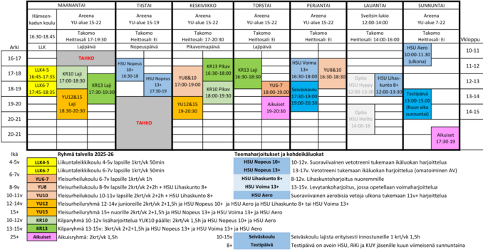 Ryhmää valitessa huomaa ikäluokka: se ikäluokka, jossa urheilija ensi vuonna 2026 kisaa. Esimerkki: Tänä vuonna 9v täyttävä (syntynyt 2016) menee 10v-ryhmään. Liikuntaleikkikouluihin osallistuvat nyt 3-6 -vuotiaat eli ensi vuonna 4-7 vuotta täyttävät.