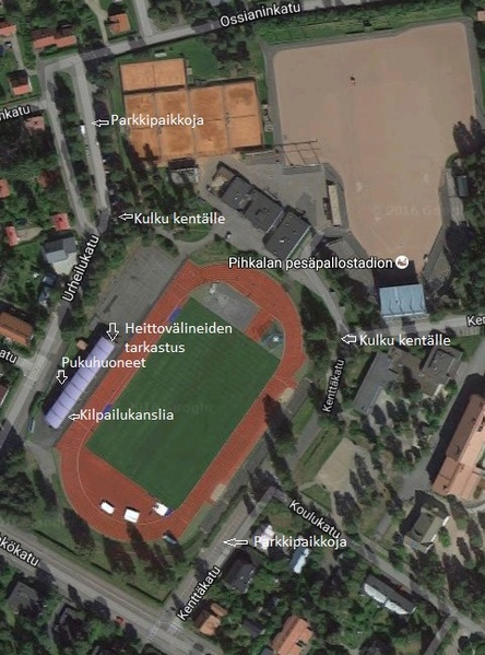 Kilpailut järjestetään Hyvinkään Urheilupuiston yleisurheilukentällä, osoitteessa Urheilukatu 19. Varsinaisia parkkipaikkoja on niukasti, autot on pääosin pysäköitävä katujen reunoille.