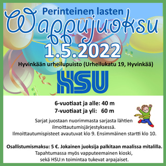 Sarjat juostaan nuorimmasta vanhimpaan ilmoittautumisärjestyksessä alkaen klo 10. Tulokset tulevat näkyville HSU:n nettisivuille tapahtuman jälkeen. Osallistumismaksu 5 € (käteismaksu). Kaikki osallistujat saavat mitalin! Tapahtumassa palvelee myös vapputeemainen kioski, sekä arpajaiset (myös korttimaksu).