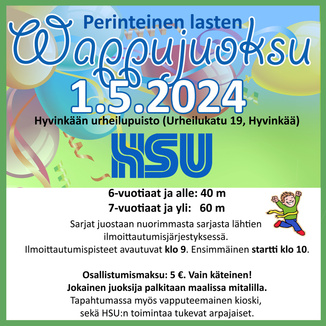 Viime vuonna lähes 300 lasta liikuttanut Wappujuoksu tulee taas! Tapahtuma järjestetään maanantaina 1.5.2024 Hyvinkään urheilupuistossa (Urheilukatu 19). Ilmoittautuminen ja lajipisteet aukeavat klo 09:00. Wappujuoksut juostaan nuorimmasta vanhimpaan sarjaan ilmoittautumisärjestyksessä alkaen klo 10:00. Juoksukilpailussa nuorimmat osallistujat ovat olleet 1-2-vuotiaita, joten perheen pienimmätkin ovat tervetulleita juoksemaan. Osallistumismaksu 5 €/lapsi (vain käteismaksu). Kaikki osallistujat saavat mitalin. Urheilukentällä pääsee suorittamaan myös yleisurheilun lajipassia, ja uutena lisänä kentältä löytyy kaksi kilpailupistettä myös aikuisille!