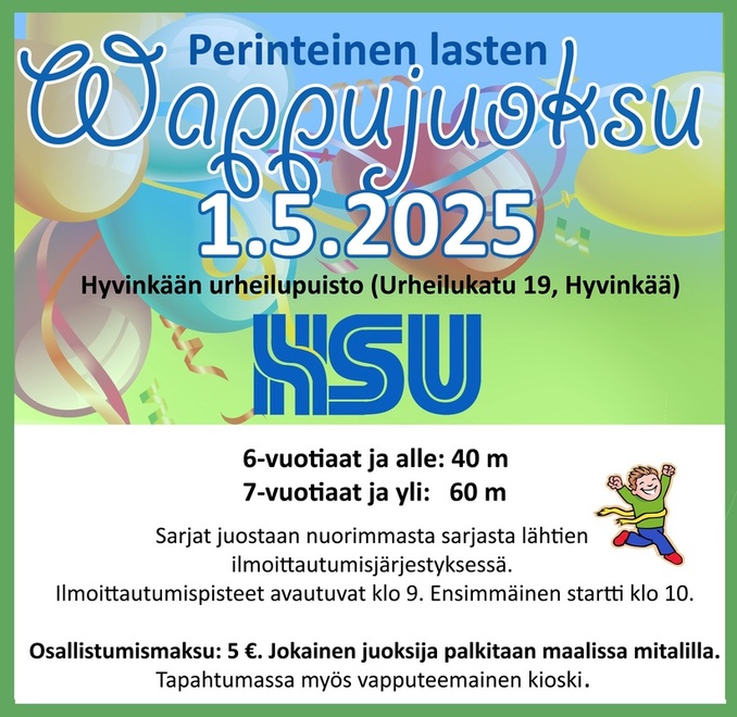 Tapahtuma järjestetään torstaina 1.5.2025 Hyvinkään urheilupuistossa (Urheilukatu 19). Ilmoittautuminen ja lajipisteet aukeavat klo 09:00. Wappujuoksut juostaan nuorimmasta vanhimpaan sarjaan ilmoittautumisärjestyksessä alkaen klo 10:00. Juoksukilpailussa nuorimmat osallistujat ovat olleet 1-2-vuotiaita, joten perheen pienimmätkin ovat tervetulleita juoksemaan.
